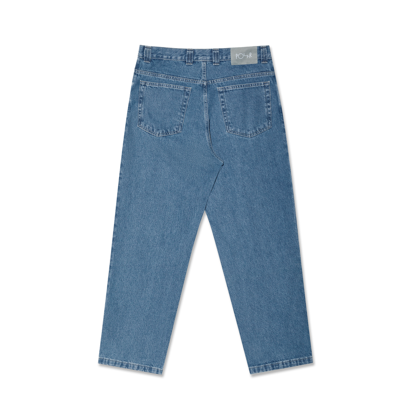Crafted from 100% cotton denim weighing 435 GSM, these mid-blue pants feature a YKK zipper and a bespoke YKK button. Designed with embroidery and a woven label, they offer a low waist, dropped crotch, straight leg, and an oversized silhouette for a refined yet relaxed look.