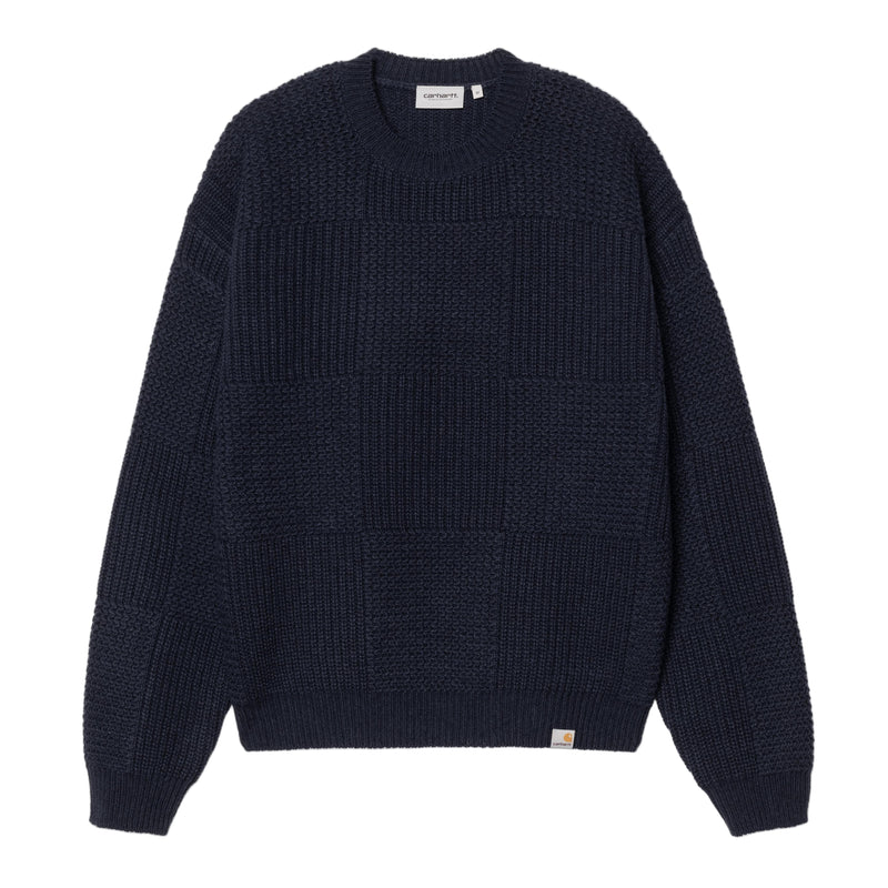 The Bishop Sweater is a heavyweight knit made from wool-rich yarn in a tonal checkerboard pattern. A woven Square Label appears at the hem.