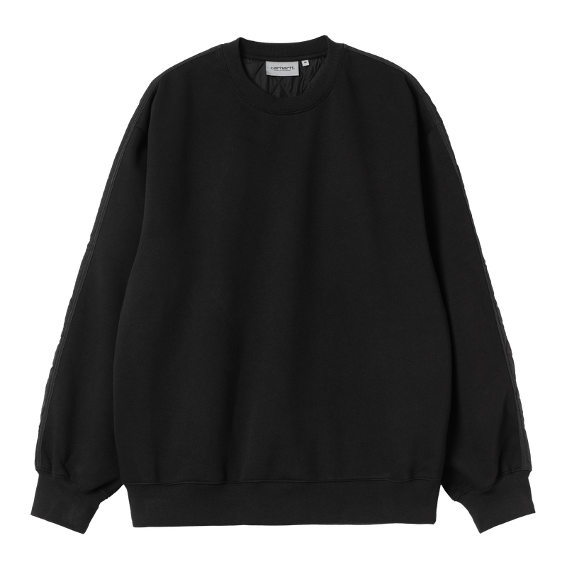 This black sweatshirt features a balloon fit with a brushed texture and a fully diamond-quilted polyester ripstop back panel. It is detailed with tape running along the sleeves and shoulders, complemented by a graphic print. Crafted from a 420 g/m² blend of 80% cotton and 20% polyester, it offers both comfort and durability.