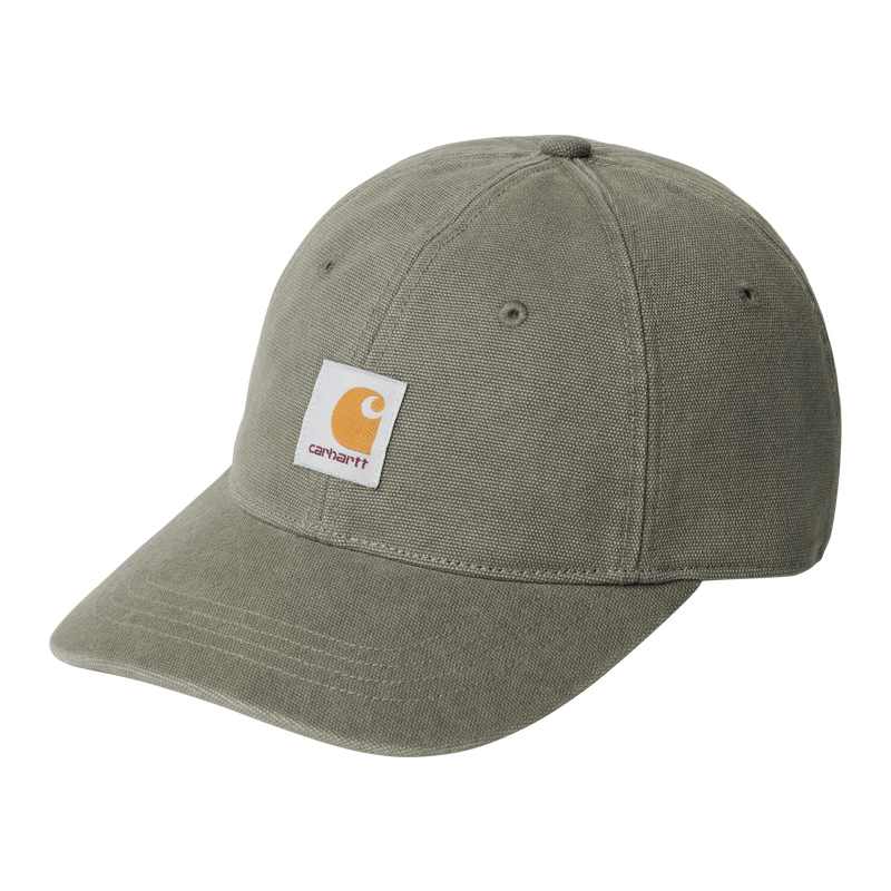 The Canvas Cap is a six-panel style made from cotton canvas with a reinforced front panel. It has a firm, curved peak, as well as metal ventilation eyelets and an adjustable strap. A woven Square Label appears on the front.