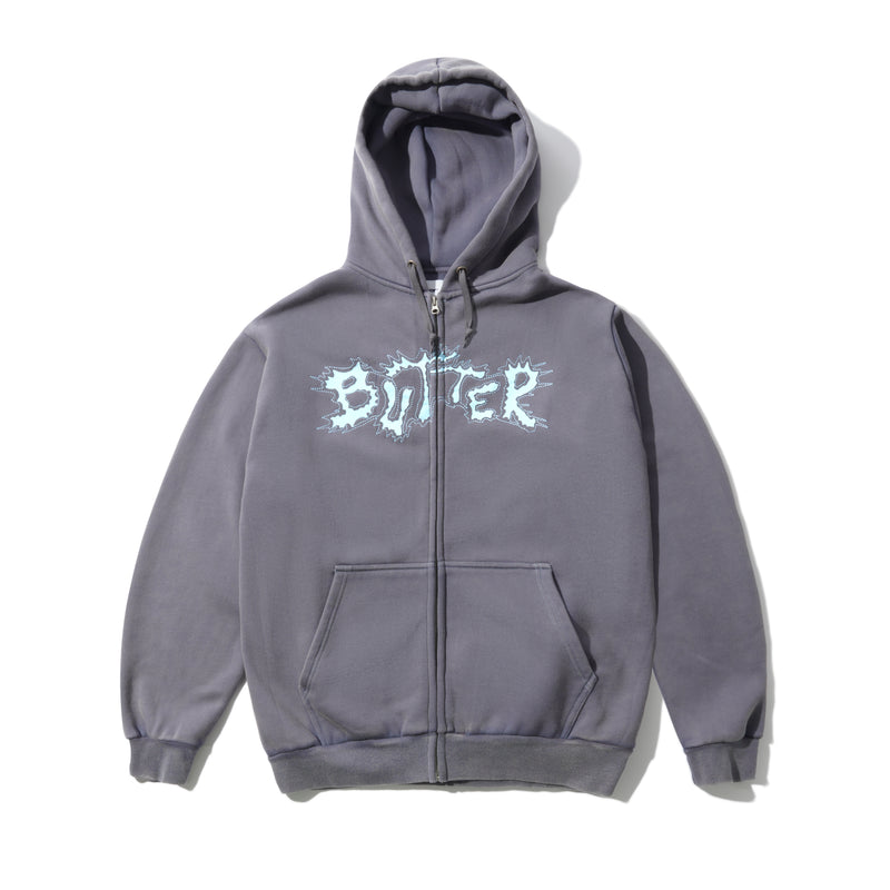 This ERUPTION ZIP-THRU HOOD DENIM combines durability and style with its 12oz (380 gsm) cotton/polyester fleece blend, offering warmth and comfort. Featuring a zip-through closure and mineral wash for a distinctive look, it includes contrast stitching and drawcords on the hood for adjustable fit. The front displays a detailed screen print complemented by direct embroidery, enhancing its expert craftsmanship and visual appeal.