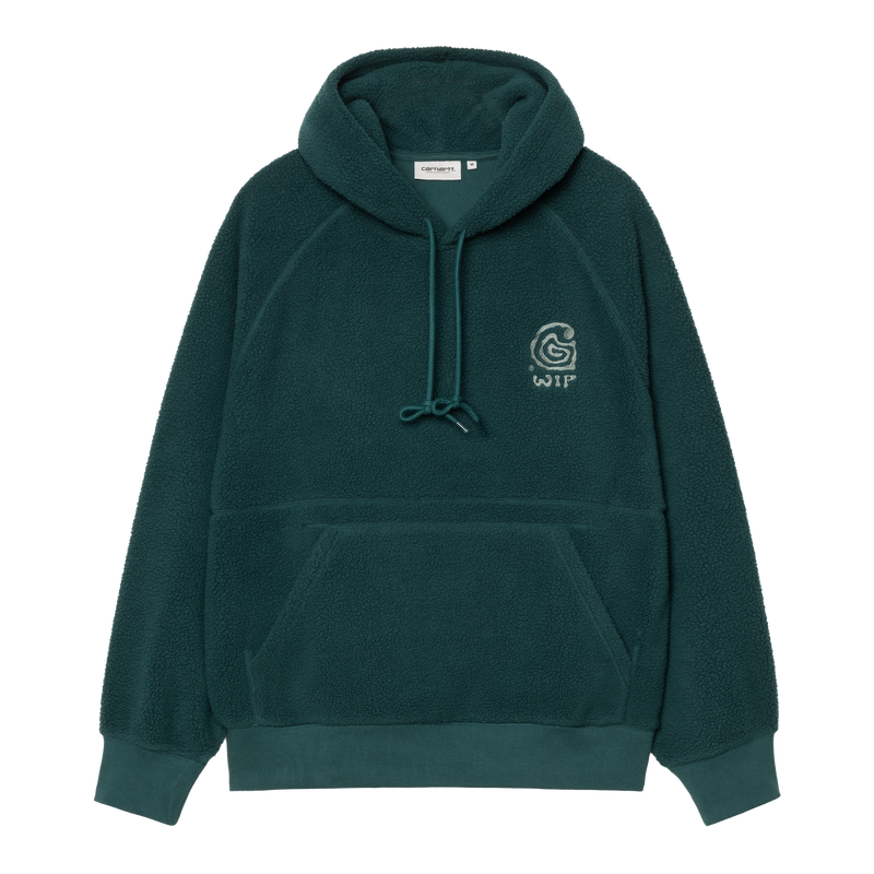 This hoodie features a balloon fit with a soft brushed texture, an adjustable hood, and flatlock stitching for durability. It includes a kangaroo pocket and detailed graphic embroidery, crafted from 100% polyester fleece weighing 250 g/m² for comfortable warmth.