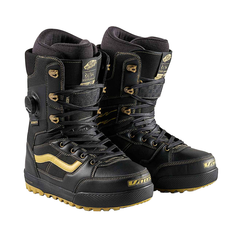 The Invado Pro Renne Rinnekangas Black / Gold snowboard boots offer exceptional versatility for riders seeking professional-level performance. Featuring the Vans Hybrid BOA Fit system, they provide unlimited customization and superior heel support through the Custom Slide Guide. The V2 UltraCush Smartwool liner ensures warmth and comfort, while the thermo-moldable core delivers a precise fit. Combined with the terrain-responsive V2 Waffle Pro outsole, these boots guarantee unmatched control and all-day wearability on any slope.