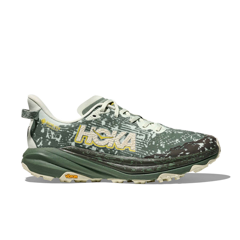A workhorse for sloppy, wet conditions. The Speedgoat 6 GORE-TEX is now even more comfortable with GORE-TEX's Invisible Fit waterproof membrane for a lighter, more flexible construction to help avoid pressure points. Grounded in a Vibram® Megagrip with Traction Lug outsole for increased bite on loose soil, this trail icon employs a foot-cradling heel bolster, lightweight, responsive midsole compound, and a protective toe rand for charging through the rough stuff. Bring it, weather.
