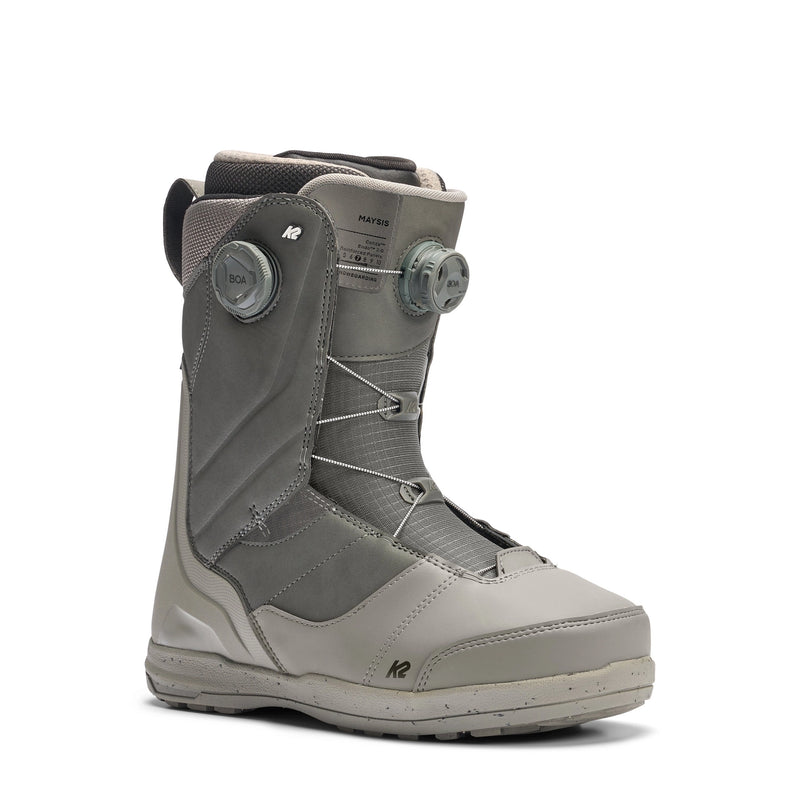 The MAYSIS GREY snowboard boot combines advanced technology with expert craftsmanship to deliver a precise, comfortable fit and reliable performance. Featuring a heat-moldable liner made from open-cell Intuition® foam, it contours perfectly to your leg, ankle, and foot for customized warmth and comfort. Its innovative Conda™ liner lacing system, powered by a BOA® Fit System dial, ensures a secure heel lock and natural ankle flex. The articulating cuff minimizes knee bend distortion, while abrasion-resistant rubber enhances durability. Built to perform like a workhorse, the MAYSIS GREY offers lasting support and responsiveness on the mountain.