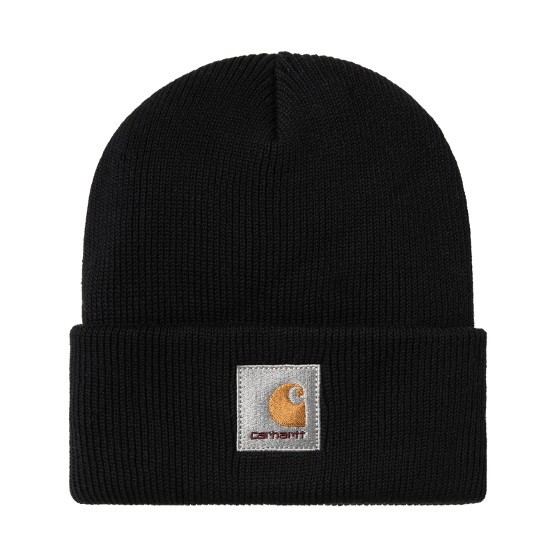This beanie measures 22.5 cm (8.8 inches) in height and is crafted from stretchable rib-knit fabric. It features an embroidered label and is made entirely from 100% organic cotton with a 6-gauge knit, combining comfort with refined quality.