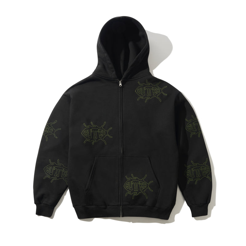 This Roach Zip-Thru Hood in black combines a durable 12oz cotton/polyester fleece blend for lasting comfort and warmth. Featuring precision all-over direct embroidery and a practical 2-way zip-through closure, it offers versatility and style. Its loose, boxy fit with a relaxed hem and shorter length ensures a contemporary silhouette while maintaining ease of movement. Consult the sizing guide for the perfect fit tailored to your preferences.