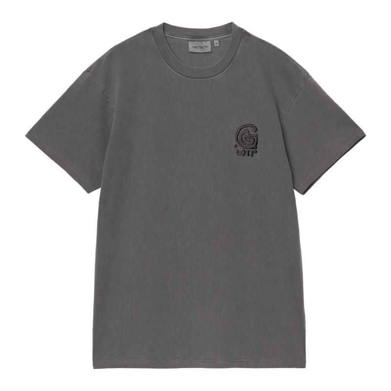 This black garment-dyed t-shirt features a relaxed fit and detailed graphic embroidery. Crafted from 100% cotton single jersey with a weight of 230 g/m², it offers both comfort and quality.