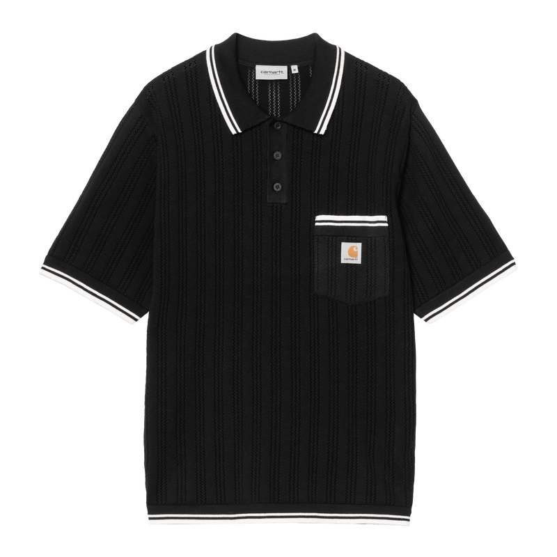 The S/S Ramsey Polo is a lightweight cotton knit featuring an allover, open ajour design with contrasting striped trims. The style has a buttoned half-placket and a chest pocket, accented with a woven Square Label.