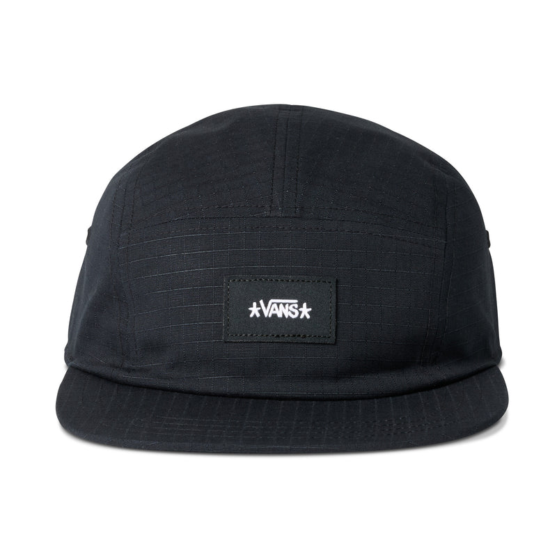 The Skate Atiba Haze 5 Panel Hat in black features a flat visor that maintains its shape and a snapback design ensuring a secure, comfortable fit. Crafted from durable ripstop cotton, this cap offers lasting wear. The prominently applied logo and collaborative details from Atiba x Haze give it a timeless Vans-inspired look, combining classic style with sturdy construction.