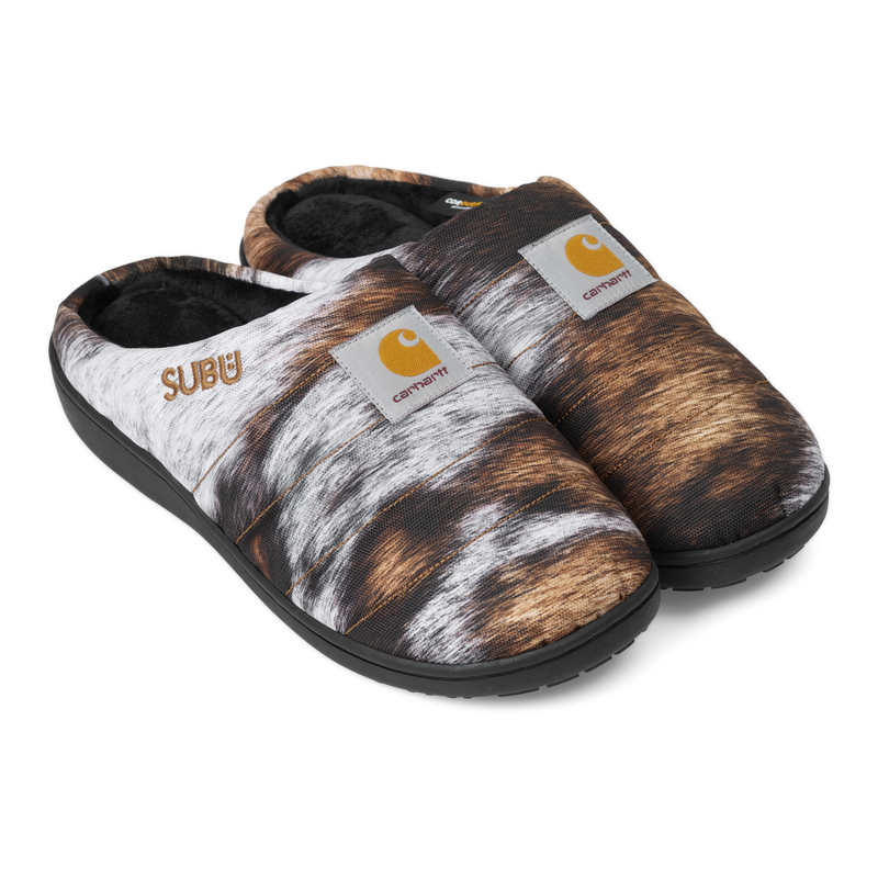 Originating from Japan, Subu crafts comfortable slip-on shoes designed for warmth and ease. These slippers feature a flame-resistant Cordura® upper, a plush fabric with raised fibers, and a four-layer cushioned insole for exceptional comfort. Included is a coordinating carry bag and a distinctive square label. Made entirely of 285g/m² Polyester Cordura®.