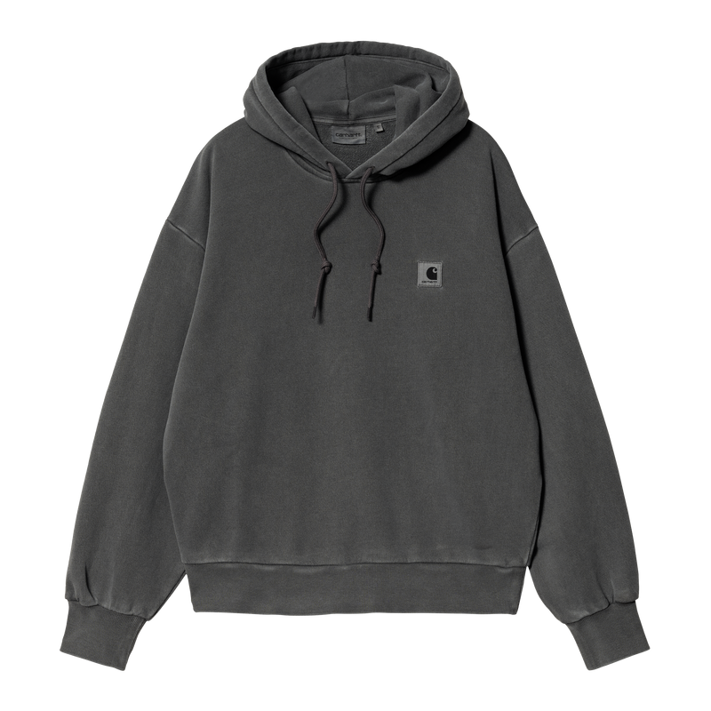 This women's hooded sweatshirt combines relaxed silhouette with refined construction details. Crafted from raw cotton jersey with a distinctive loopback texture, it features a generously cut balloon fit enhanced by dropped shoulders and snug ribbed cuffs. The garment-dyed finish delivers a softly muted, lived-in aesthetic while maintaining color depth. A woven Square Label on the left chest completes the design. Pure cotton construction ensures breathability and durability for everyday wear.